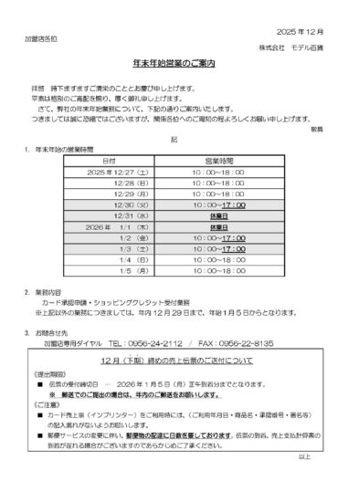年末年始営業のご案内(加盟店様向け)