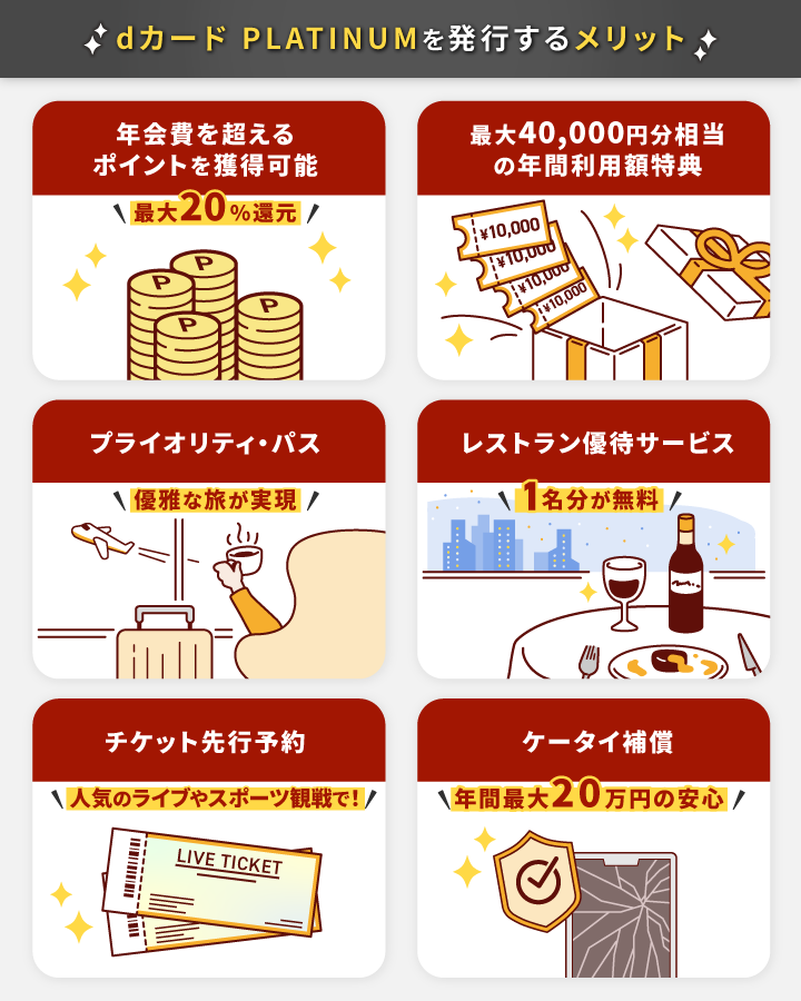 また、プライオリティ・パスやレストラン優待サービス、ケータイ補償が備わっているのが三井住友カード プラチナプリファードにはないメリットです。これらの特典を重視したい人はdカード PLATINUMの方が向いているといえます。